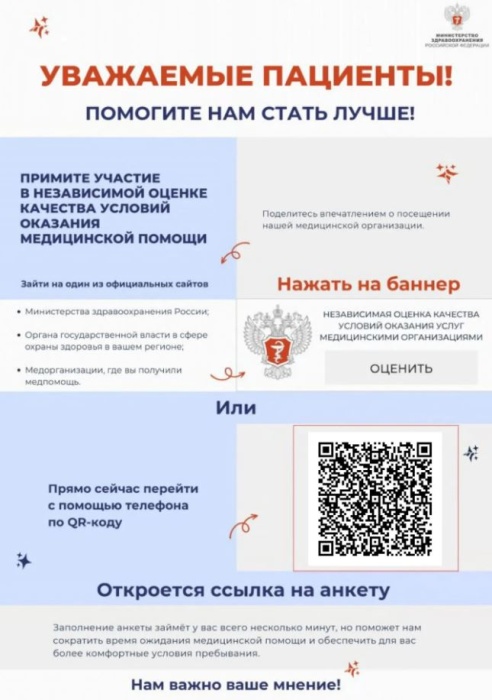 Независимая оценка качества условий оказания услуг медицинскими организациями является одной из форм общественного контроля и проводится с целью предоставления гражданам информации о качестве условий оказания услуг медицинскими организациями, участвующими в реализации Программы государственных гарантий бесплатного оказания гражданам медицинской помощи в Республике Башкортостан.Уважаемые пациенты!