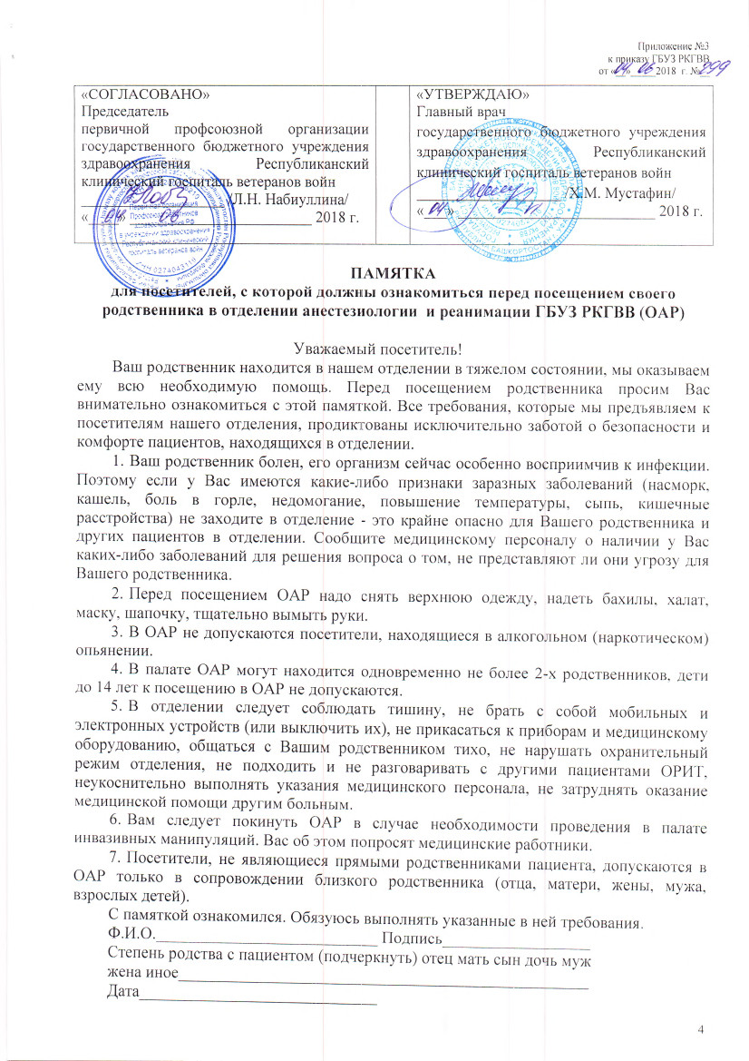 Памятка для посетителей, с которой должны ознакомиться перед посещением своего родственника в отделении анестезиологии и реанимации ГБУЗ РКГВВ (ОАР)
